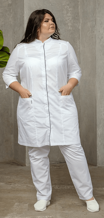 Укороченный медицинский халат прямого силуэта с застежкой на потайные кнопки. Край борта отделан кантом, который может быть выполнен из однотонной или контрастной ткани. Узкий воротник-стойка изящно подчеркивает линию шеи. Вместительные боковые карманы позволяют удобно хранить смартфон, ключи, личные и рабочие аксессуары. На спинке халата расположены полупояса,