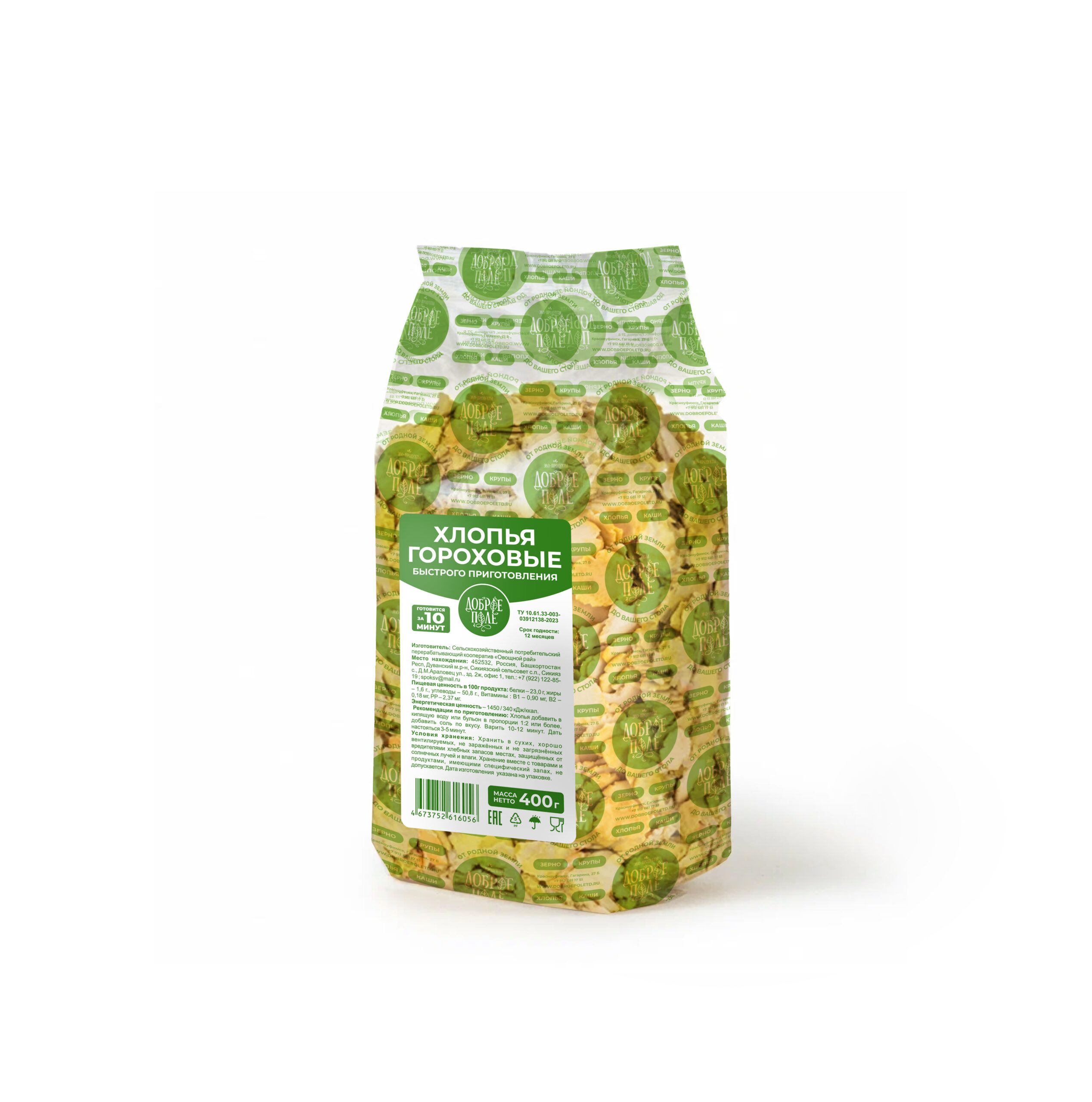 Хлопья гороховые производятся особым образом. Сырье, используемое для хлопьев абсолютно натуральное. Зерно выращено в экологически чистых регионах нашей страны. Перед тем, как изготовить хлопья, зерно проходит полный цикл обработок. Быстрота приготовления хлопьев позволяет сохранить ценные питательные вещества, которые разрушаются при длительной термообработке. Хлопья относятся к легкоусвояемым продуктам.