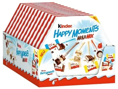 Kinder Happy Moments - это практичная упаковка с красочной смесью 5 видов вкусных мини-шоколадных конфет и батончиков, размер упаковки 162 г. Данное ассорти станет приятным сюрпризом для дорого Вам человека, Вы сможете порадовать себя после вовремя тяжелого рабочего дня и вызвать улыбку у любого ребенка!