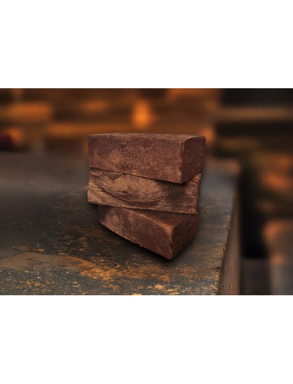 Кирпич имеет насыщенный красно-коричневый оттенок с заметными вариациями в тоне. Присутствуют более темные, почти шоколадные участки, а также области с легким красноватым подтоном. Такая неоднородность цвета придает кирпичу естественный и состаренный вид.