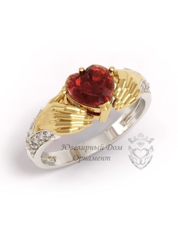 Кладдахское кольцо с гранатом - это традиционное ирландское украшение (две руки держат сердце с короной), символизирующее любовь, дружбу и верность. Гранат символизирует страсть, преданность и защиту от негатива. Такое кольцо носят как символ любви или как оберег. Данное кольцо приобретается как классический подарок для выражения крепких чувств, часто используется как помолвочное или обручальное кольцо. Металл - комбинированное золото 585 пробы. Вставка: гранат огранки Сердце 5 мм., 20 круглых фианитов 1,5 мм. Вес изделия - 3,15 гр.