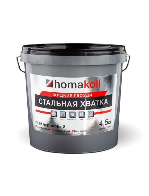 Клей homakoll Стальная хватка - это высококачественный акриловый монтажный клей для проведения ремонтно-монтажных работ внутри и снаружи помещений. Предназначен для склеивания и монтажа строительных, отделочных и декоративных материалов: кафельная плитка, натуральный камень, ПВХ-панели, пробка, стекло, пенополистирол, паркет, МДФ, дерево и т.п. Применяется только на впитывающих основаниях: бетон, цементные и гипсовые штукатурки, влагостойкая фанера, деревянные основания, гипсокартон, ДСтП, ЦСП, кирпич.