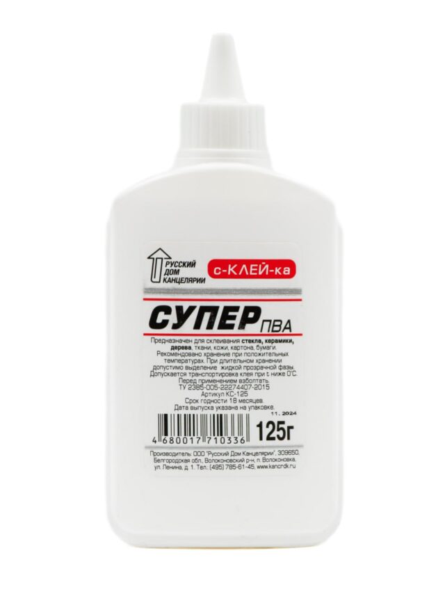 Клей ПВА супер "с-Клей-ка" предназначен для склеивания бумаги, картона, дерева, ткани, кожи, фотобумаги. Отлично подходит для хобби и творчества для взрослых и детей. Пластиковый дозатор обеспечивает точное нанесение и экономный расход. Имеется съемный колпачок, который предохраняет клей от засыхания. Клей ПВА при минусовых температурах замерзает, т.к. сделан на основе воды, но при оттаивании не теряет своих свойств. Его можно заморозить и размораживать 5 раз. Клей не потеряет ни своих свойств, ни товарного вида. Температура воздуха при использовании не ниже +5. Объем клея - 125 г.