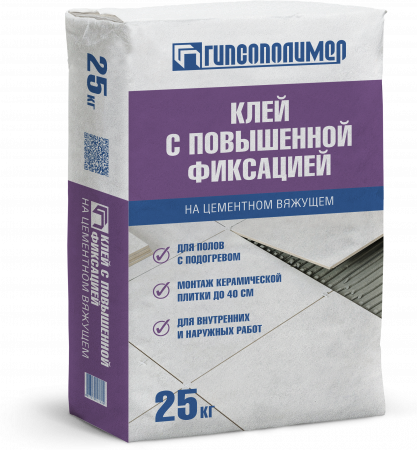Клей С ПОВЫШЕННОЙ ФИКСАЦИЕЙ цементный предназначен для облицовки стен и полов керамической и кафельной плиткой малых и средних размеров различных по типу поверхностей (кирпич, бетон, оштукатуренные основания, гипсовые и ангидридные полы, ГСП и ПГП, цементные стяжки). Может применяться для облицовки обогреваемых полов. Повышенная фиксация позволяет использовать метод укладки «сверху-вниз». Может применяться для облицовки полов керамогранитом среднего размера при внутренних работах.Используется при внутренней отделке помещений с нормальной и повышенной влажностью, при наружной облицовке зданий выше цокольной части.