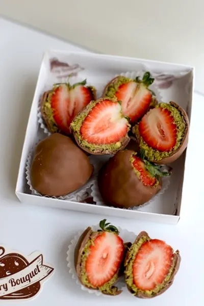 «Клубника в дубайском шоколаде» – это изумительное сочетание свежей клубники, покрытой премиальным молочным бельгийским шоколадом Callebaut, воздушного теста катаифи и насыщенной фисташковой пасты. Этот уникальный десерт станет настоящим праздником вкуса благодаря тщательно подобранным ингредиентам высочайшего качества. Закажите набор из 5 штук и наслаждайтесь каждым кусочком этого шедевра!