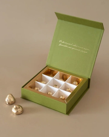 Коробка выполнена из высококачественных материалов, что гарантирует её долговечность и привлекательный внешний вид. Магнитный механизм обеспечивает надежное закрытие, сохраняя содержимое в целости и безопасности. Ложемент, специально разработанный для размещения конфет, не только надежно удерживает сладости на месте, но и добавляет элемент роскоши, подчеркивая индивидуальность вашего продукта.