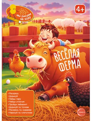 Книга занимательных заданий. Веселая ферма содержит тематические контурные изображения с достаточным количеством деталей для развития моторики и внимания, но не вызывающие у детей утомления. В книге данной серии удобный большой формат, крупные прорисованные иллюстрации, предлагаются разнообразные задания: пройти лабиринт, найти сходства и отличия, раскрасить по номерам, дорисовать картинку по точкам или пунктирным линиям, выполнить рисунок, используя клеточки, найти пару, посчитать предметы, животных и т.д. Такие задания стимулируют творческое мышление и познавательную активность ребёнка. В книге - 48 страниц. Формат - 84*108 см.