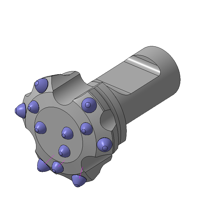 Штыревая буровая коронка с запрессованным твердым сплавом и диаметром головной части 105 мм. Предназначена для использования с погружными пневмоударниками серии П-105 (или аналогичными) и байонетным способом крепления.