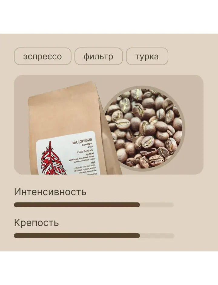 Назначение: фильтр, эспрессо. Особенно хорош в турке (джезве)