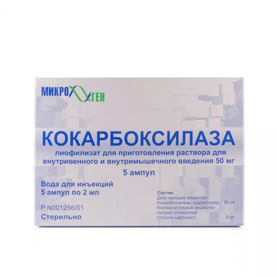 Кокарбоксилаза - это коферментная форма витамина В1 (тиаминпирофосфат), участвующая в обменных процессах. Используется в комплексной терапии для улучшения усвоения глюкозы, питания нервных тканей и нормализации работы сердечно-сосудистой системы. Применяется при сердечной, печеночной, почечной недостаточности, диабетическом кетоацидозе и хронической усталости. Форма выпуска - лиофилизат для приготовления раствора для внутривенного и внутримышечного введения по 50 мг в ампулы вместимостью 2 мл, 3 мл или 5 мл.