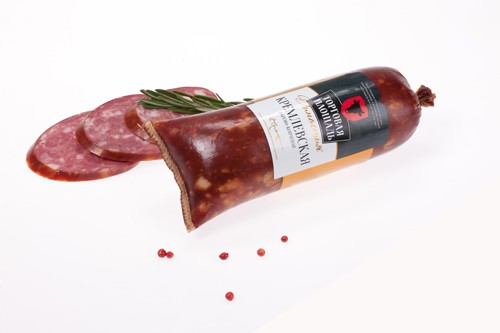 Состав: говядина, шпик свиной, вода, нитритно-посолочная смесь, белок животный говяжий, регуляторы кислотности, эмульгатор, загуститель, стабилизатор, сахара, экстракты специй (перец черный, перец красный, чеснок, паприка), ароматизаторы, консерванты, антиокислители, усилитель вкуса и аромата, краситель пищевой. Сроки годности: при t от 0°С до +6°С и относительной влажности воздуха 75-78%, продукт, упакованный с использованием вакуума или в модифицированной атмосфере - 40 суток. Вес нетто: 380 г; весовая: ≈ 400 г