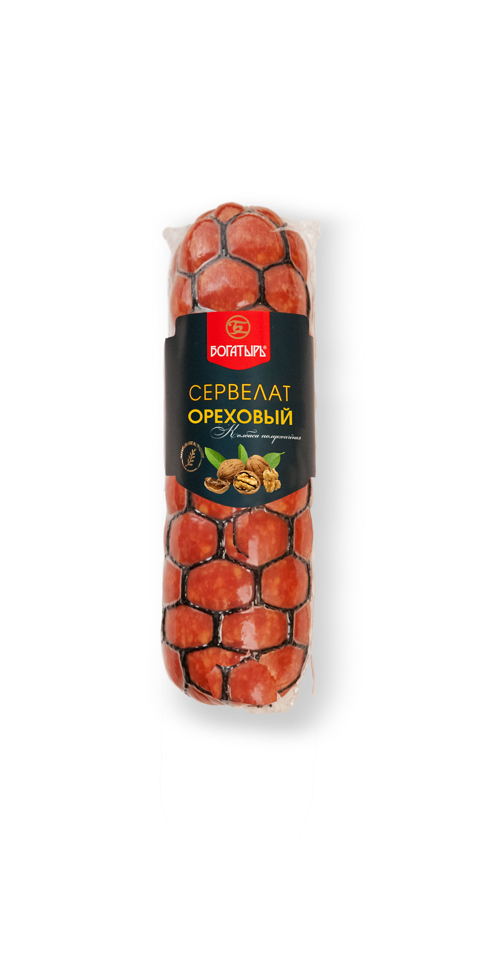 Полукопчёный сервелат из отборной свинины и свиного шпика с добавлением грецкого ореха и черного перца. Легкий ореховый акцент в сочетании с мясом придает сервелату пикантность и необычный вкус. Будет идеально сочетаться с хрустящим багетом и овощами., красным сухим вином и мягкими сырами. Упаковано в вакуум.