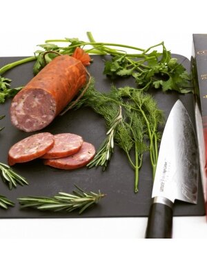 Изделие с ярким пряным вкусом и довольно крупной текстурой, яркие нотки можжевельника и зеленого перца оттеняются паприкой, базиликом и мускатным орехом.