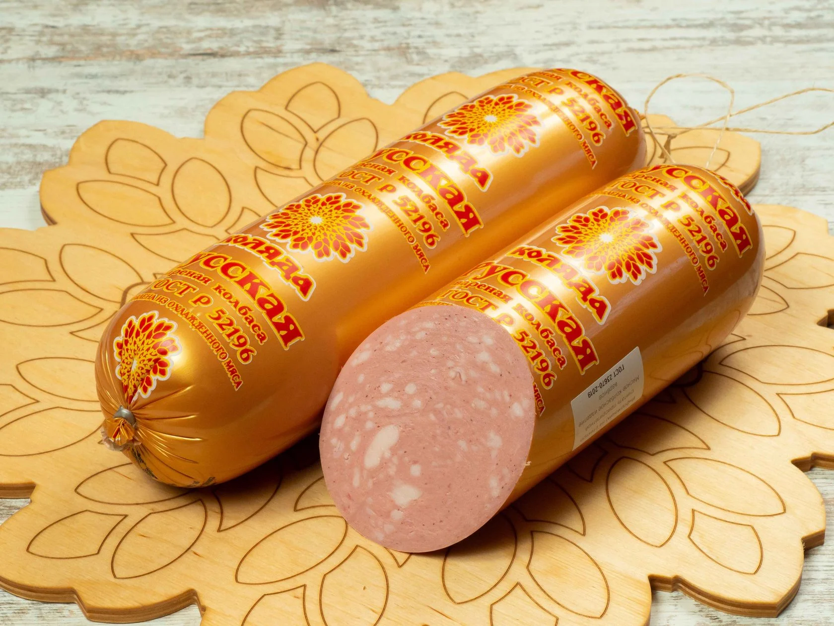 Классика российского колбасного производства. Розовый ломтик с белыми кусочками нежнейшего шпика — символ эпохи, а пряный оттенок свежего чеснока — исконно русское дополнение, завершающее образ.