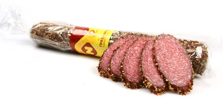 ТУ 9213-140-00425283 Вес — около 0,550 кг Диаметр — 45 мм Упаковка — вакуумная упаковка Тип оболочки — без оболочки в декоративных специях Основные ингредиенты — свинина, шпик, говядина, соль, сахар, пряности, специи; обсыпка: специи, желатин Срок годности и условия хранения — 4 месяца при t от 0°С до + 12°С Кратность в г/к — 7 шт