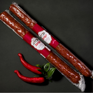 Сырокопченая колбаса Пепперони - это вид салями, обычно изготавливаемый из свинины и говядины, с добавлением специй, таких как перец чили, паприка, а также фенхель и другие. Она отличается насыщенным вкусом и яркими острыми нотами благодаря используемым специям, а также копчению на натуральной щепе.