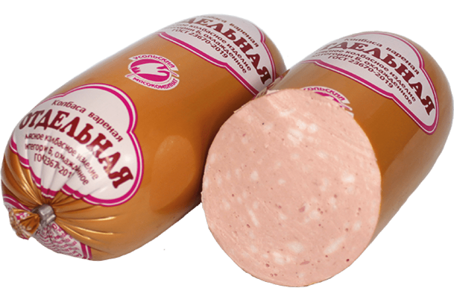 Колбаса вареная «Отдельная» мясной продукт категории Б ГОСТ Р 52196-2011 Состав: Говядина, свинина, шпик, вода питьевая, нитритно-посолочная смесь (соль поваренная пищевая, фиксатор окраски - нитрит натрия), сахар – песок, перец черный молотый, перец душистый молотый, чеснок свежий.