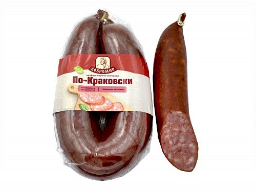 Колбаса варено-копченая "По-краковски" 400 г (Добромир). Продукт мясной категории В, охлажденный.