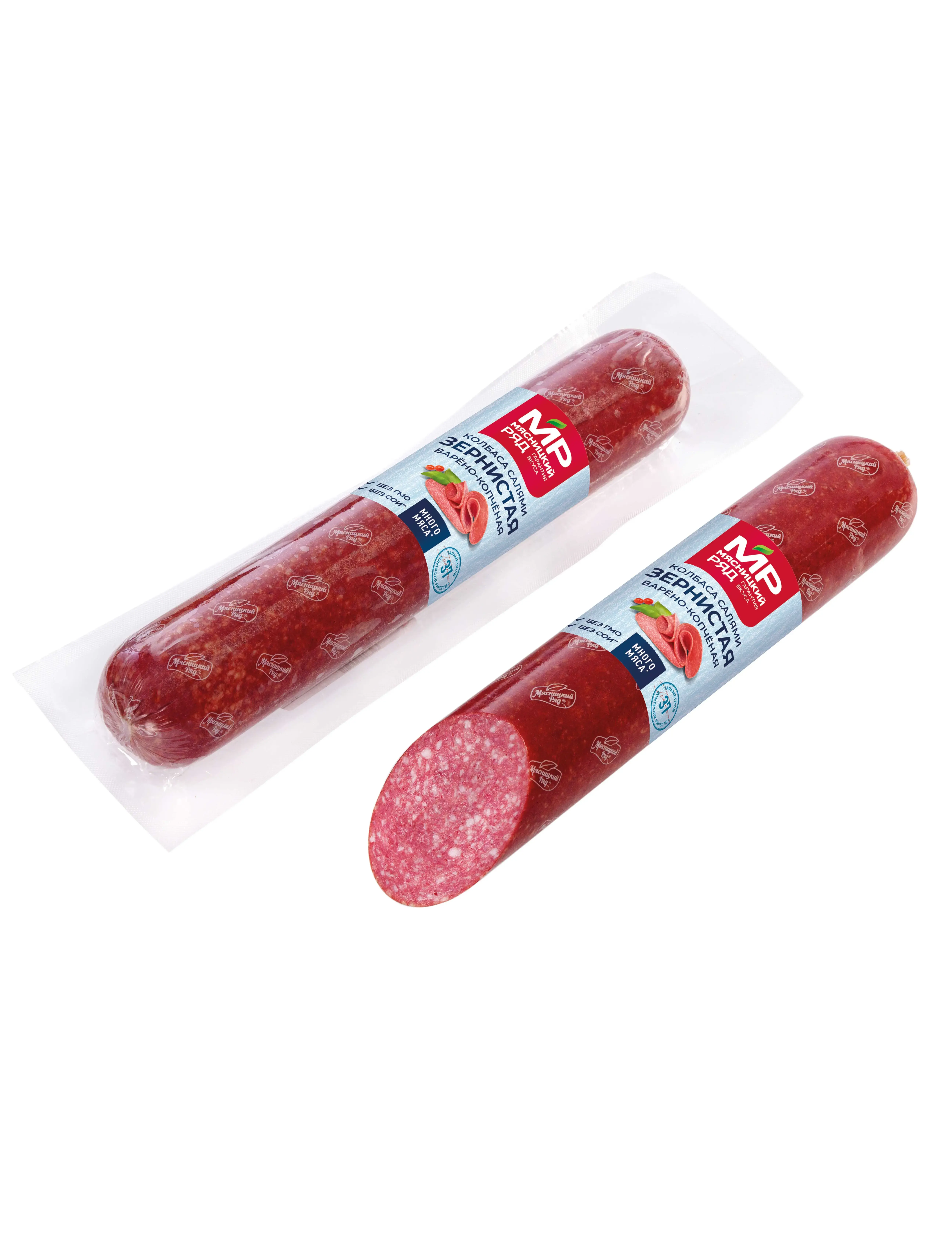 Классический мелкозернистый срез. Структура колбасы нежная, сочная, но умеренно плотная. Приятный вкус.