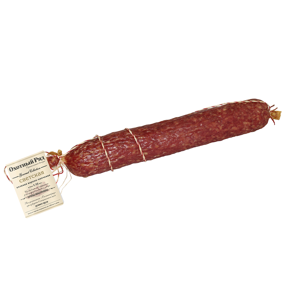 Этот деликатес изготовлен в точном соответствии со старинным рецептом. Благодаря особой технологии копчения продукт приобретает легкий, приятный аромат. Колбаса подсушивается естественным образом при определенной температуре, что позволяет максимально раскрыть весь спектр оттенков ее вкуса. Прекрасно сочетается с благородными сортами вин и традиционными русскими напитками на основе меда. Изготавливается колбаса в специальном цехе ручногог труда и имеет ограниченный выпуск.