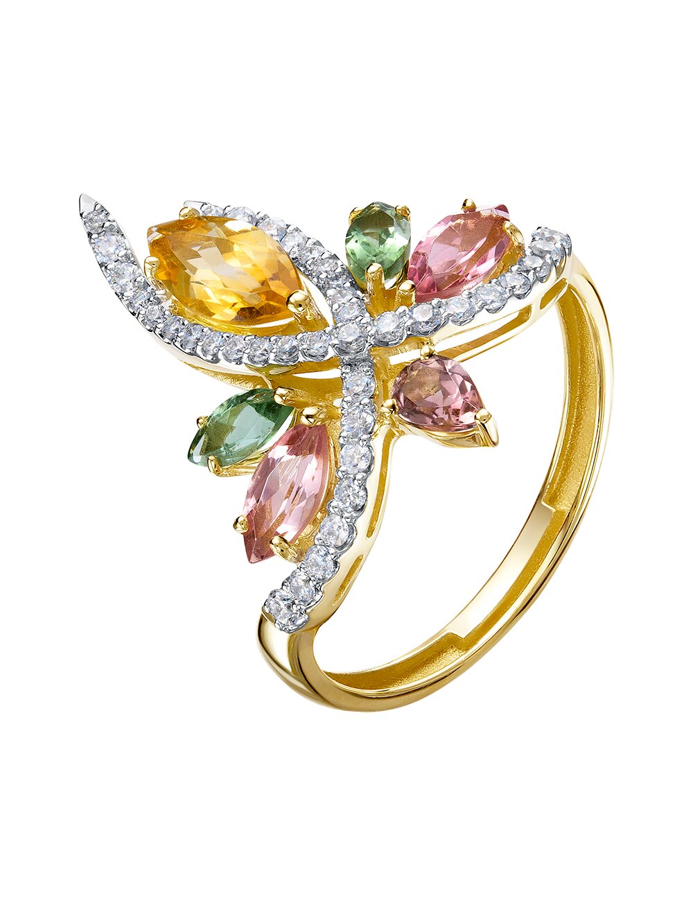 Кольцо из жёлтого золота с бриллиантами, турмалинами и цитрином - это изысканное, яркое ювелирное изделие, часто выполненное в стиле коктейльных колец. Оно сочетает теплую классику золота, блеск бриллиантов и насыщенные цвета цветных камней, создавая роскошный образ. Идеально подходит для торжественных мероприятий, добавляя роскоши и цветового акцента. Сочетание драгоценных камней подчеркивает высокий статус. Цитрин считается камнем, приносящим удачу, уверенность и улучшающим настроение. Вставка: 2 бриллианта Кр 57 3/6 0.006ct, 2 турмалина маркиз 6*3, 19 бриллианта Кр 57 3/6 0.152ct, 2 бриллианта Кр 57 3/6 0.028ct, 2 турмалина маркиз 5*2.5, 15 бриллиантов Кр 57 3/6 0.060ct, 1 йитрин маркиз 8*4, 1 турмалин груша 4*3.