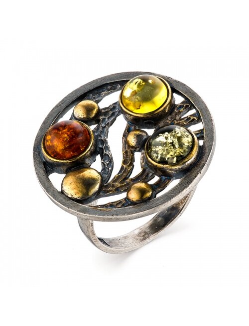 Кольцо Янтарная палитра - это ювелирное изделие,выполненное из серебра 925 пробы с использованием нескольких оттенков натурального янтаря (от желтого до вишневого и зеленого), создающих эффект многоцветности. Оно служит стильным аксессуаром, оберегом от сглаза и источником целебной янтарной кислоты. Крупное эффектное серебряное кольцо со вставками из натурального прессованного янтаря разных оттенков точно не останется незамеченным. Эффектное сочетание оксида и позолоты. Средний вес - 5,65 гр.