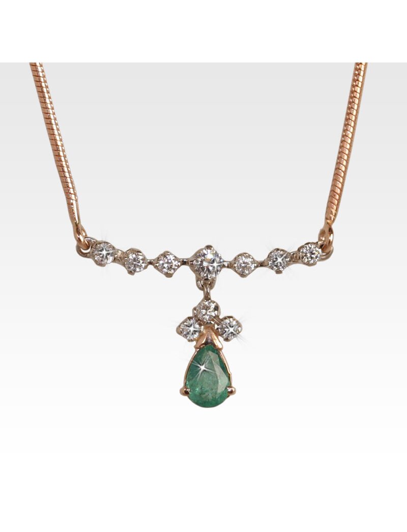 Колье из золота с изумрудом и бриллиантами - это классическое ювелирное изделие премиум-класса, сочетающее насыщенно-зеленый изумруд и сверкающие бриллианты в оправе из золота 585 пробы. Оно предназначено для торжественных выходов, подчеркивания статуса, а также служит роскошным подарком, символизирующим гармонию и мудрость. Вставки: бриллианты 10 шт., весом - 0,36 карат; изумруд 1 шт., весом - 0,35 карат. Вес изделия - 6.37 гр.