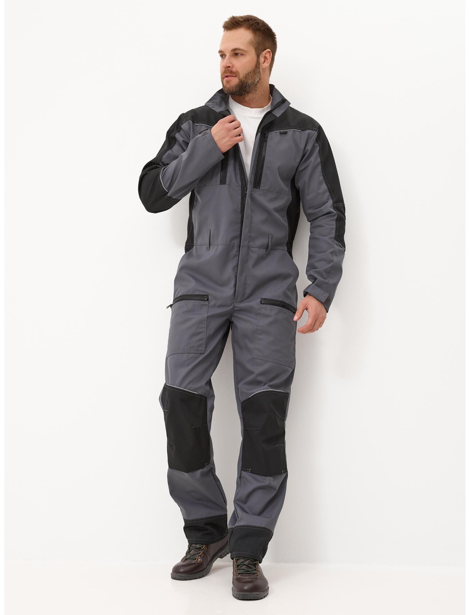Комбинезон Орион серый имеет:центральная застежка на молнию-трактор с цельнокроеной планкой, воротник стойка, 2 нагрудных с боковым входом и застежкой на молнию,, кокетки полочек и спинки из отделочной ткани. Из под срезов выходят фрагменты светоотражающего канта, бочки из отделочной ткани, комбинированные рукава с объемными налокотниками и застежкой низа на пату с липучкой, на спинке по талии внутри проходит перфорированная резинка с возможностью регулирования объема, передние карманы брюк с косым входом, 2 задних настрочных кармана, над наколенниками 2 настрочных кармана с входом на молнии, эргономичные фигурные наколенники из отделочной ткани с внутренним отделением под вкладыш, над наколенниками и под коленями сзади в швах фрагменты свотооражающего канта, отрезные нижние части брюк из отделочной ткани, все участки, подверженные нагрузке, усилены закрепками.