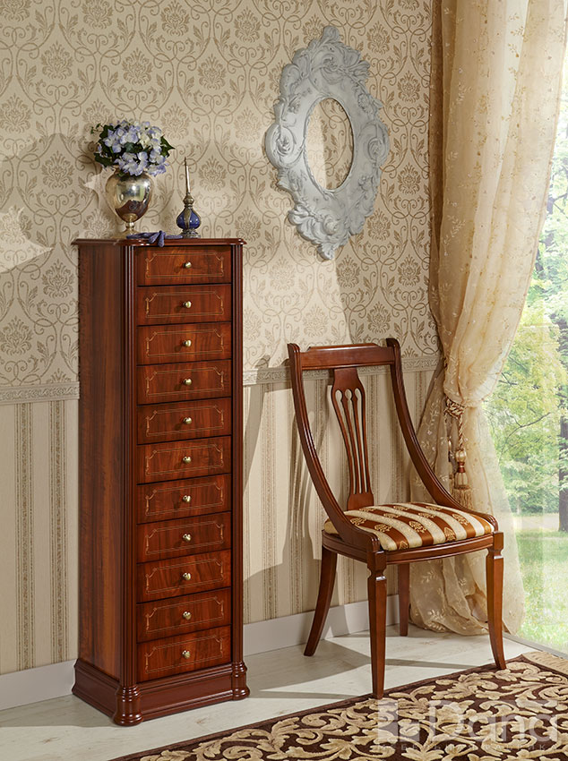 Ширина 455 Высота 1475 Глубина 340 Серия Вспомогательная мебель Стиль Классическая мебель Функциональное назначение Комоды Цвет корпуса Орех-пекан Уникальный комод в классическом испанском стиле, при максимально компактном размещении на жилой площади комнаты обладает максимальной вместимостью за счет наличия 11 выдвижных ящиков. Выполнен из материалов - МДФ, ДСП. Текстура фасада повторяет натуральный срез орехового дерева, многослойная лакировка с мягким глянцем, шелкография. Европейская фурнитура. Относительно небольшие габариты этого изящного комода позволяют легко разместить его в комнате: гостиной, прихожей, столовой, и при этом, наличие в комоде одиннадцати выдвижных ящиков помогут организовать хранение массы различных мелких вещей и документов.