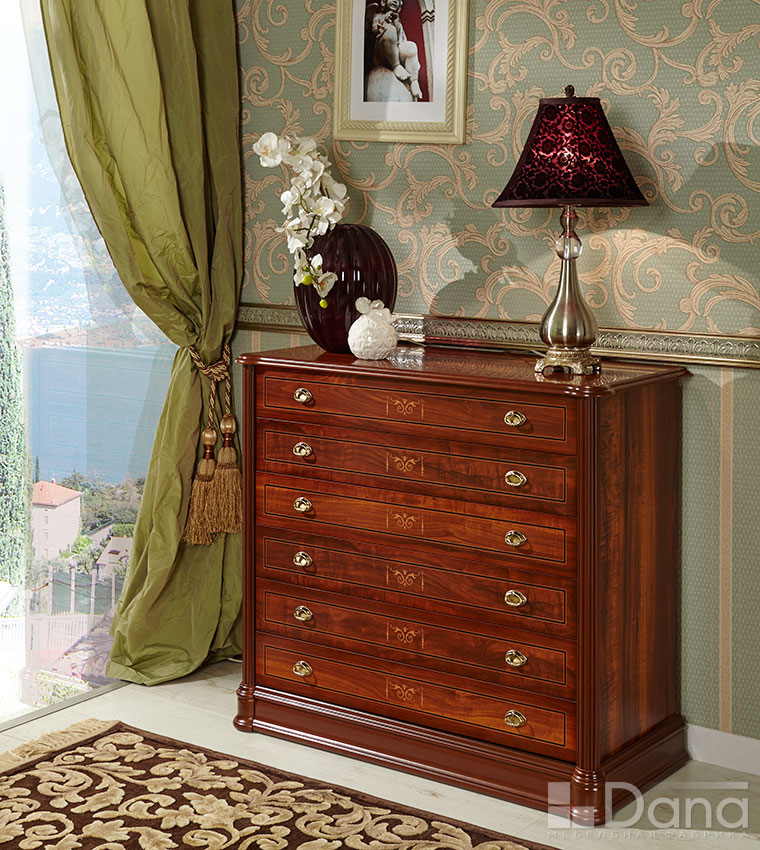 Комод классического испанского стиля, выполнен из материалов - плиты МДФ, ДСП. Многослойная лакировка с умеренным глянцем, шелкография. Текстура фасада повторяет срез орехового дерева. Оптимальный габарит и наличие шести широких выдвижных ящиков придают комоду высокую функциональность и возможность размещения в любой комнате. Ширина 980 Высота 860 Глубина 430 Серия Вспомогательная мебель Стиль Классическая мебель Функциональное назначение Комоды Цвет корпуса Орех-пекан