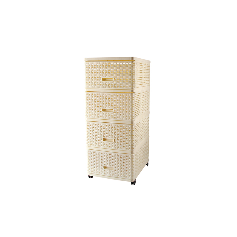 Комод ПЛЕТЕНЫЙ 4-х секционный - это шкаф с четырьмя выдвижными ящиками, выполненный из пластика, имитирующего плетеное натуральное изделие. Его предназначение - хранение личных вещей, одежды, документов и прочих предметов, а также служить декоративным элементом в интерьере, подчеркивая стиль и поддерживая порядок. Размер изделия - 400*500*985 мм. Комод данной модели может быть выполнен в разных цветах: белый, бежевый, кремовый, коричневый.