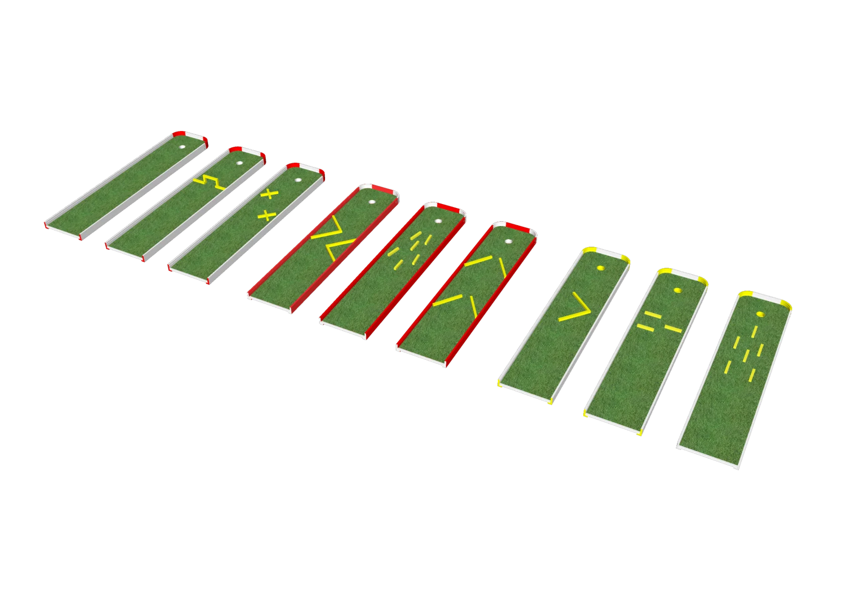 Комплект дорожек для игры в мини гольф City 9.3 - это модульная система для создания игрового поля, предназначенная для развлечения и игр в мини-гольф дома, в офисе или на мероприятиях, состоящая из сборных секций с алюминиевым каркасом, покрытием (ковролин/искусственная трава) и препятствиями (арки, горки, домики), что позволяет легко ее собирать, разбирать и перемещать. Комплект состоит из 9 дорожек, длина дорожки 3 метра. Рекомендуемая площадка для размещения - от 30 кв.м Каркас дорожек выполнен из алюминиевого профиля и пластиковых соединений. Борта дорожек окрашиваются атмосферостойкой, ударопрочной, стойкой к царапинам и сколам эмалью, цвет на выбор заказчика. В качестве игровой поверхности используется композитное основание 3 мм. толщиной, с покрытием из искусственной травы или коммерческого ковролина В базовой комплектации поставляются препятствия из алюминиевого профиля, которые крепятся к игровому основанию. Размеры - 300*64*13 см.