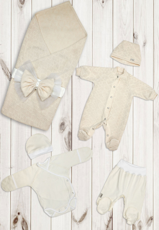 Комплект на выписку "ВИОЛА" - это стильный, летний набор одежды и аксессуаров для новорожденного на момент его первого выхода из роддома, созданный, чтобы малыш был одет тепло, комфортно и выглядел красиво для фотографий. Комплект состоит из 7 предметов: одеяло-плед 90х90см (+-5см); комбинезон вязаный (р-р 56см); полукомбинезон-боди (р-р 56см); ползунки трикотажные (р-р 56см); шапочка вязаная (р-р 38см); шапочка трикотажная (р-р 38см), бант на резинке. Ткань - вязаное полотно (48% вискоза, 24% х/б, 24% п/э, 4% спандекс). Бельё - 100% х/б (интерлок). Цвета - кремовый, экрю.