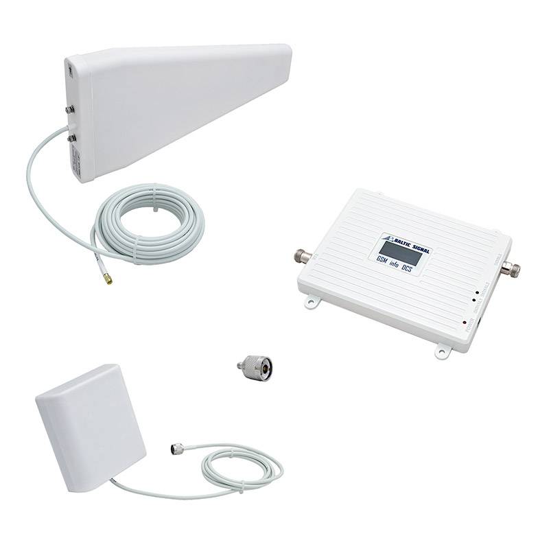 Комплект усиления мобильной связи на базе двухдиапазонного репитер (900 и 1800 МГц) и совместимых широкополосных антенн.