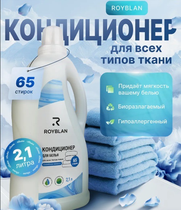 Представляем вам кондиционер для белья от отечественного производителя ROYBLAN. Этот продукт, объемом 2.1 литра, станет незаменимым помощником в уходе за вашим текстилем. Кондиционер подходит для всех типов тканей, обеспечивая бережный уход и отличные результаты. Аромат альпийской свежести наполнит ваше белье легкостью и чистотой, даря ощущение свежести и комфорта. Благодаря специальной формуле, кондиционер помогает сохранить яркость цветов и текстуру тканей, предотвращая их износ. Это идеальный выбор для тех, кто ценит качество и заботится о долговечности своей одежды. Все продукты ROYBLAN сертифицированы и соответствуют современным стандартам безопасности. Кондиционер для белья безопасен для здоровья и окружающей среды, что делает его отличным выбором для семей с детьми и людьми, склонными к аллергиям. Кроме того, он является биоразлагаемым, что подчеркивает ответственность производителя за экологические аспекты. Использование кондиционера очень простое: просто добавьте его в последний этап стирки. Вы ощутите, как ваше белье становится более мягким, приятным на ощупь и легко поддается глажению. Продукт также помогает уменьшить статическое электричество, что делает процесс использования одежды еще более комфортным. Выбирая кондиционер от ROYBLAN, вы выбираете надежность и качество, проверенное временем. Наполните ваше белье ароматом свежести, обеспечивая при этом высокий уровень ухода и защиты тканей. Этот кондиционер – это не просто продукт, это ваш помощник в создании уюта и комфорта в каждом дне. Доверяйте только лучшему для вашего дома и семьи. С кондиционером ROYBLAN ваше белье будет радовать вас своим состоянием и непревзойденным ароматом на протяжении долгого времени.