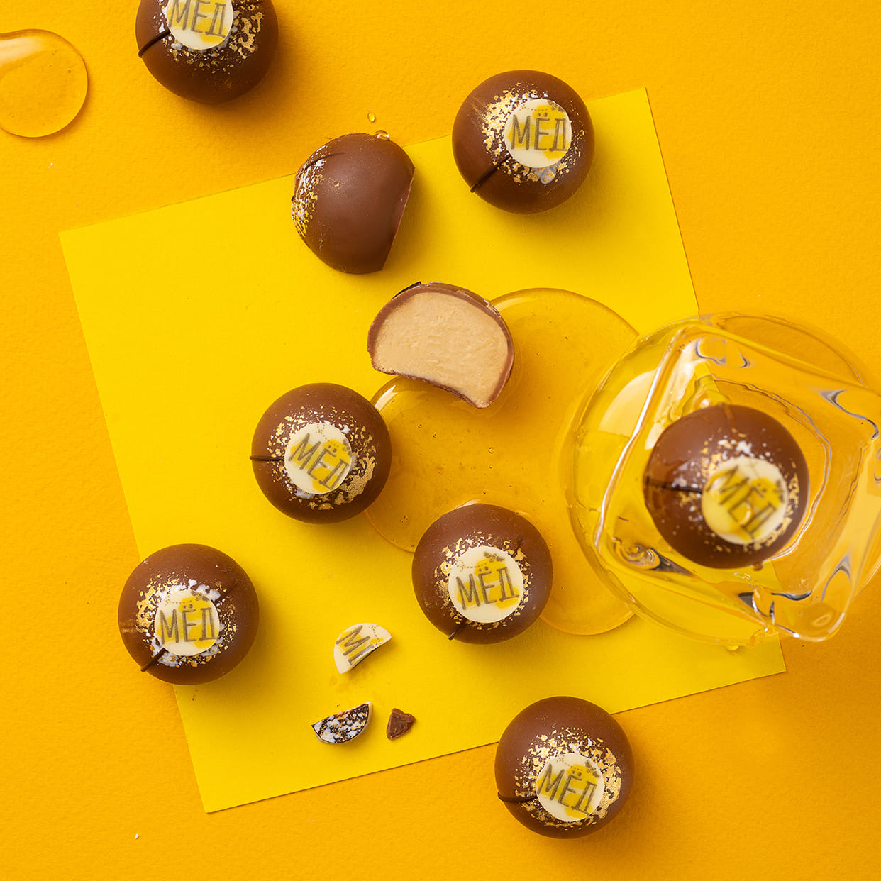 Конфеты с молочно-кремовой начинкой на основе натурального меда с добавлением бисквита, покрыты карамельным молочным шоколадом, декорированы пластинкой из белого шоколада и золотой шоколадной краской Нежное сочетание молочного шоколада со сливочной начинкой, которая с теплым медовым оттенком во вкусе.