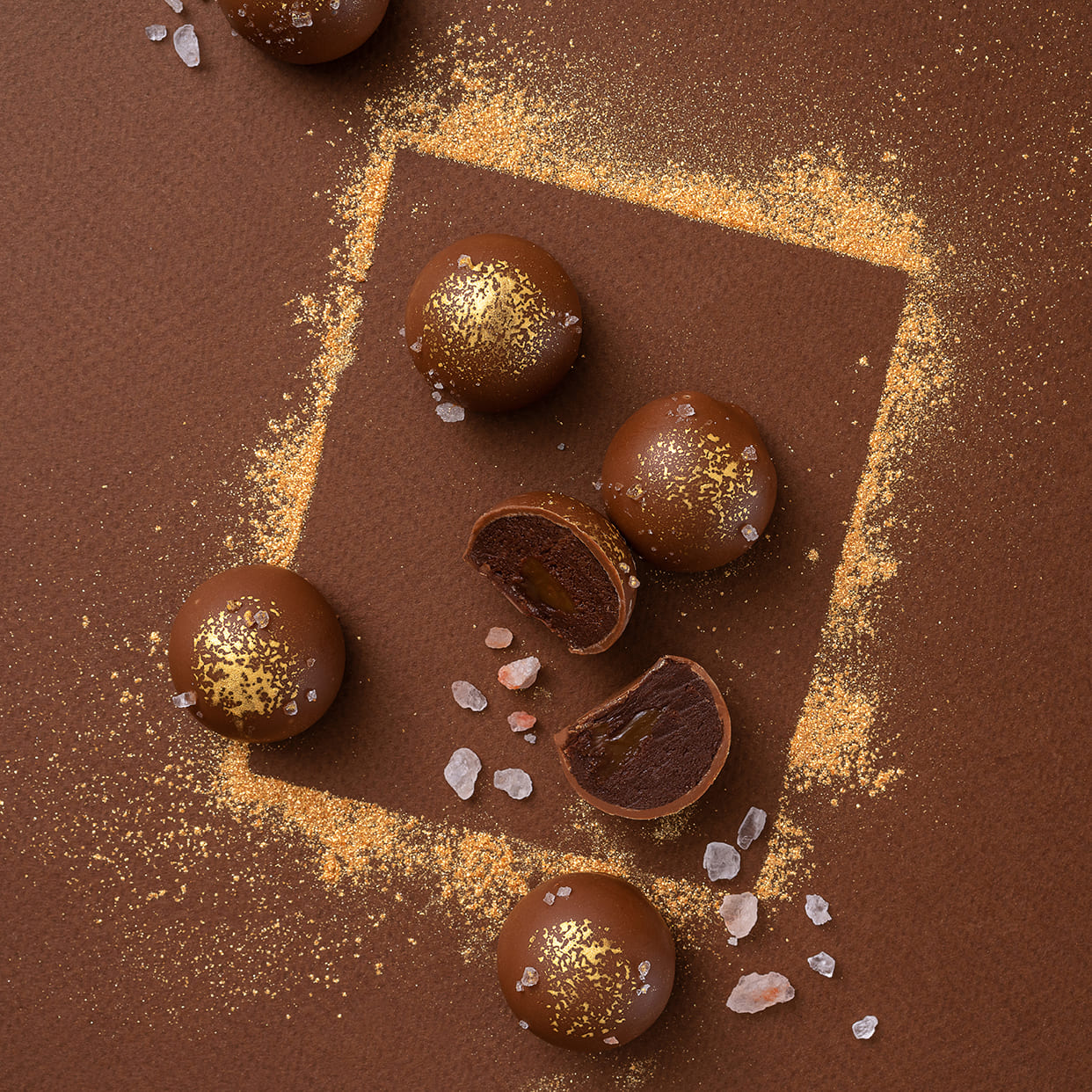 Конфеты c карамельной начинкой, добавлением гималайской соли, покрыты карамельным молочным шоколадом, декорированы золотой шоколадной краской.Классическое сочетание нежной приятной карамели с молочным шоколадом, которую идеально дополняет и делает вкус более ярким – гималайская соль.