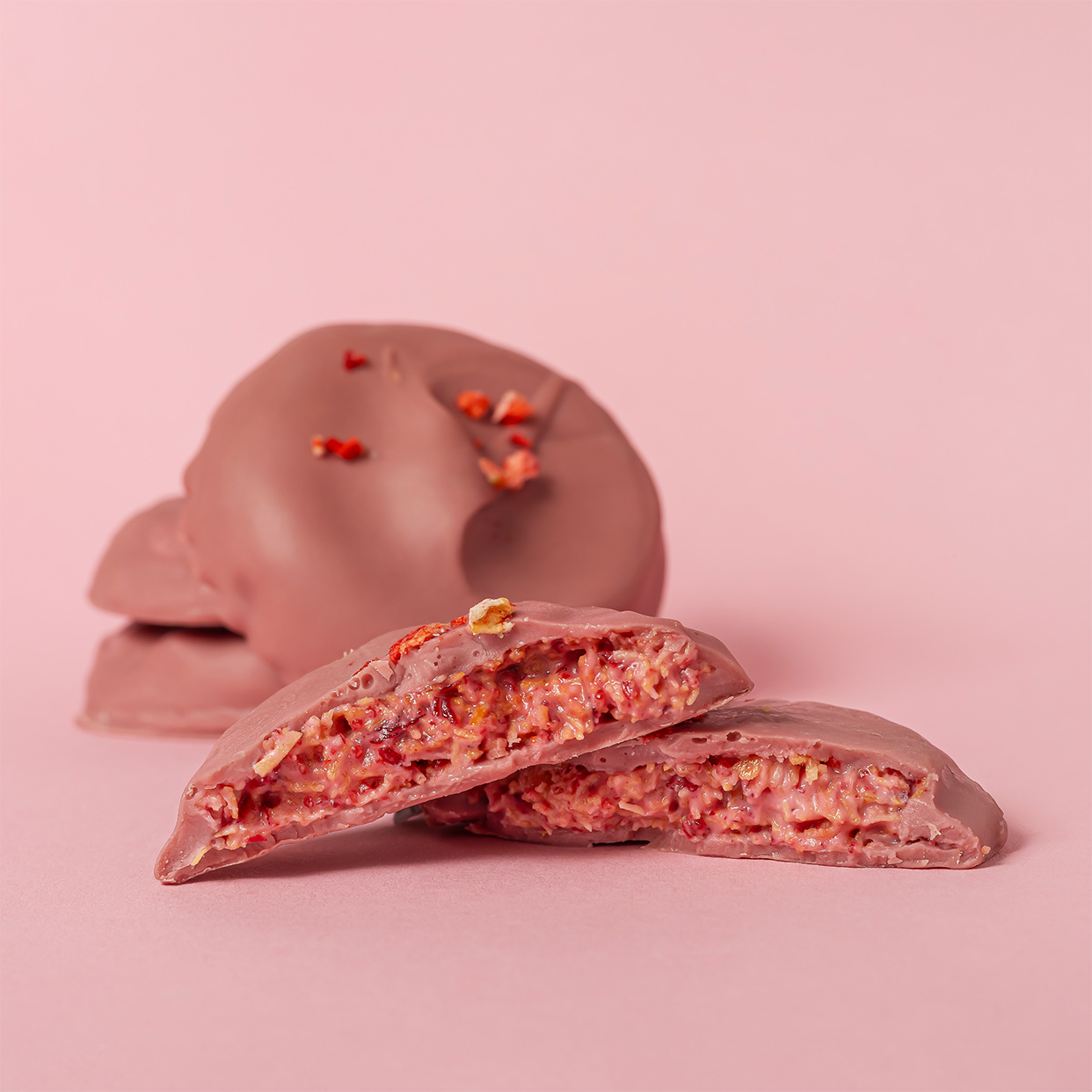 Деликатная сладость шоколада Руби ярко раскрывается в кремовой начинке с клубнично-малиновым вкусом и легкой кислинкой. Ягодная феерия отлично дополнена хрустящей вафельной крошкой и тонкими нитями теста Катаифи, что придает конфете особую игру вкусов crispy (много хруста).