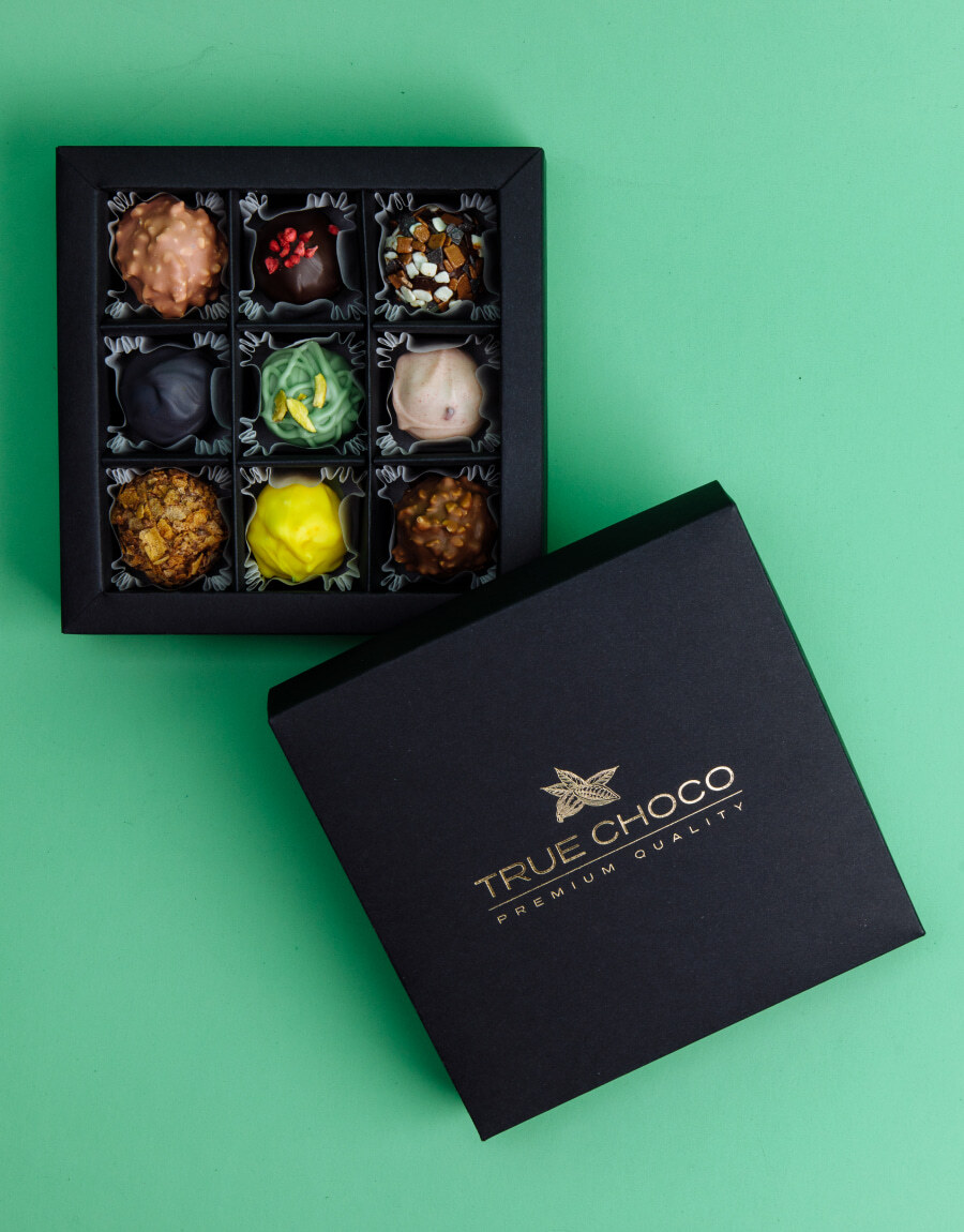 Набор из девяти трюфелей премиального качества. Конфеты изготовлены из высококачественного бельгийского шоколада, натуральных фруктовых пюре, отборных орехов.