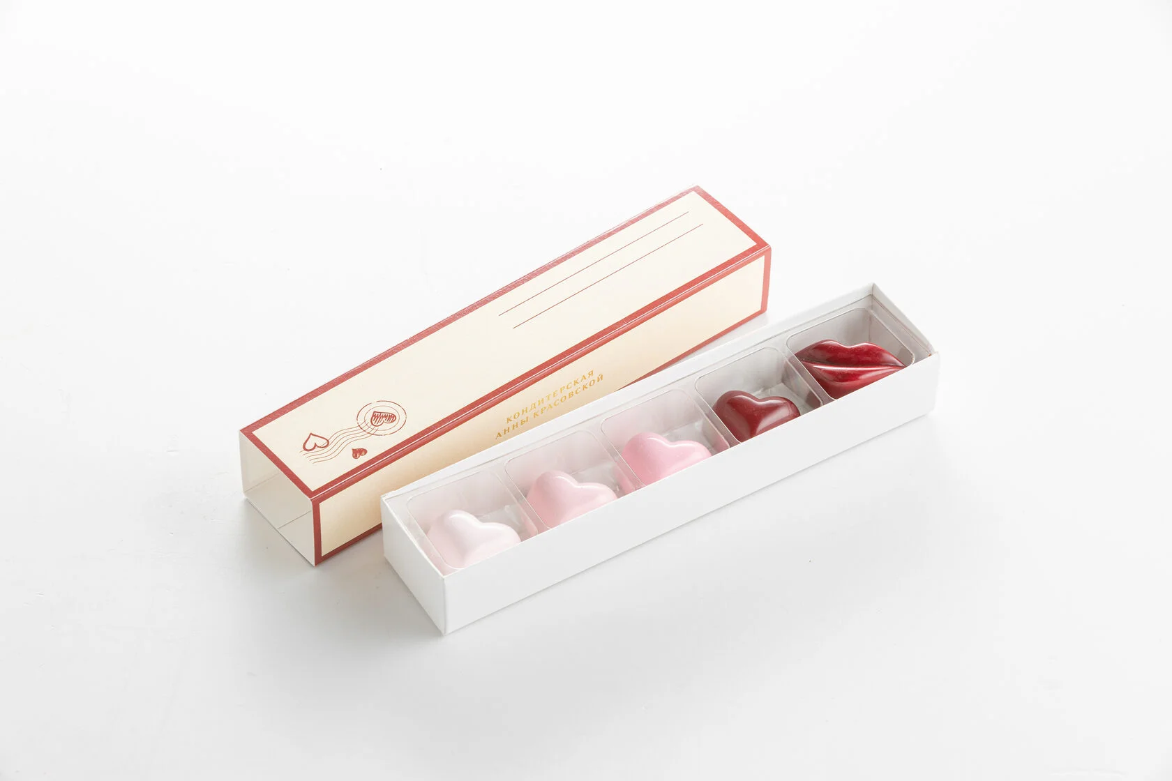 Пять авторских конфет, собранных в коробку-валентинку. Внутри ассорти сердечек: белый шоколад с маракуйей, карамельный с арахисом, молочный с фундуком, тёмный с мёдом и яркие губы из горького шоколада с виски. Коробка выполнена в форме валентинки — на ней можно написать своё послание. Или доверить его нам и отправить анонимно.