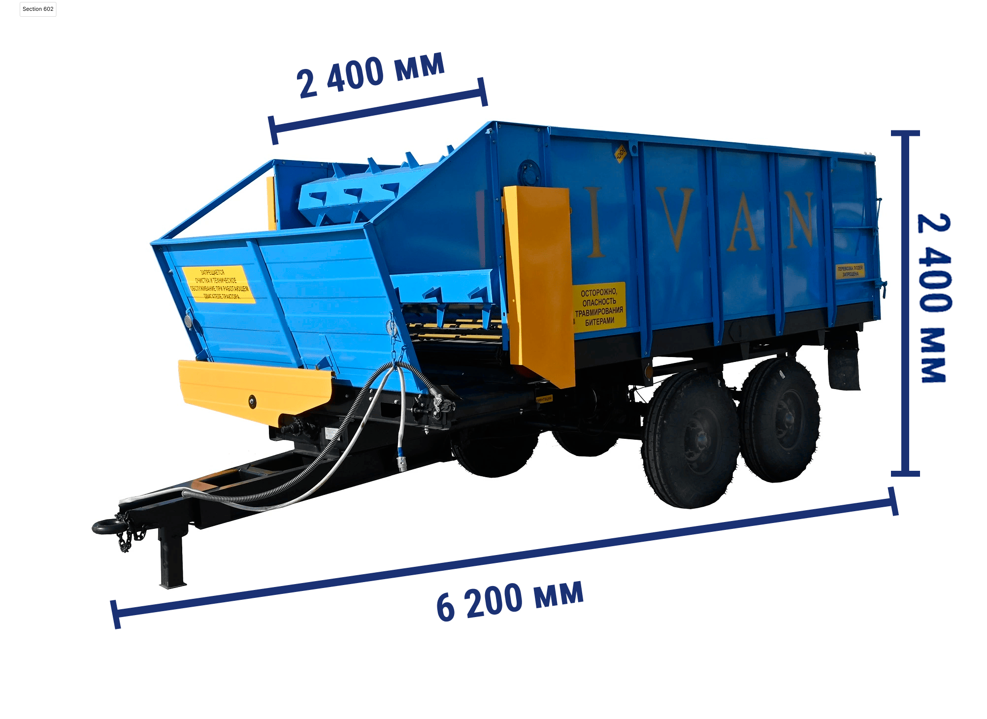 Кормораздатчик КТП-10У предназначен для транспортирования и дозированной раздачи измельченных кормов, обслуживания кукурузоуборочных и силосоуборочных машин в качестве транспортного саморазгружающегося прицепа, дозированной подачи измельченных кормов к средствам загрузки кормохранилищ и к внутрифермерским стационарным раздатчикам кормов. Вместимость - 10 м³., грузоподъемность не более 4000 кг., длина - 6200 мм., ширина - 2400мм., высота - 2400 мм., масса конструкционная - 2300 кг.
