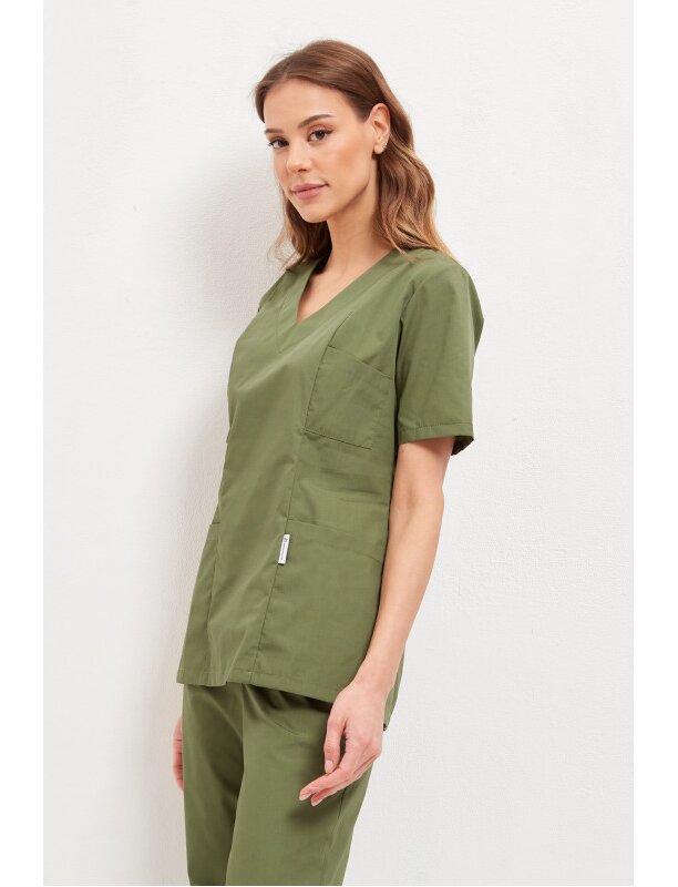Костюм №280 хаки состоит из куртки и брюк. Куртка полуприлегающего силуэта с V-образным вырезом горловины. Рельефы, выходящие из плечевых швов. Вдоль рельефов на полочках расположены 2 боковых и 1 нагрудный карманы. Брюки свободного покроя. Талию подчеркивает широкий эластичный пояс.