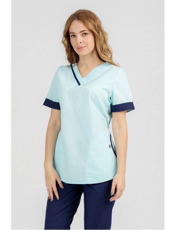 Костюм №285 голубой/синий имеет блузу полуприлегающего силуэта с небольшим клешением по бедрам. На передней части куртки карманы с боковым входом, обработанные окантовкой. V-образный вырез горловины, обработанный планками. Нагрудные вытачки. Рукава короткие, с отложными манжетами. Спинка цельнокроённая с кулисой по талии. Пояски-завязки на спинке, вход в карман, отделка на планке с правой стороны, манжеты рукавов, обтачка горловины спинки выполнены из отделочной ткани. Низ изделия с фигурными подрезами, обработан швом в подгибку с открытым срезом. Брюки свободного покроя. Талию подчеркивает широкий эластичный пояс.