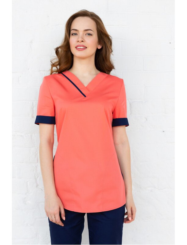 Костюм №285 персик/синий имеет блузу полуприлегающего силуэта с небольшим клешением по бедрам. На передней части куртки карманы с боковым входом, обработанные окантовкой. V-образный вырез горловины, обработанный планками. Нагрудные вытачки. Рукава короткие, с отложными манжетами. Спинка цельнокроённая с кулисой по талии. Пояски-завязки на спинке, вход в карман, отделка на планке с правой стороны, манжеты рукавов, обтачка горловины спинки выполнены из отделочной ткани. Низ изделия с фигурными подрезами, обработан швом в подгибку с открытым срезом. Брюки свободного покроя. Талию подчеркивает широкий эластичный пояс.