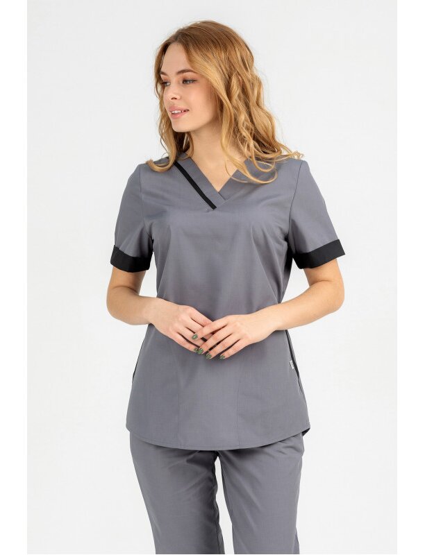 Костюм №285 серый/черный имеет блузу полуприлегающего силуэта с небольшим клешением по бедрам. На передней части куртки карманы с боковым входом, обработанные окантовкой. V-образный вырез горловины, обработанный планками. Нагрудные вытачки. Рукава короткие, с отложными манжетами. Спинка цельнокроённая с кулисой по талии. Пояски-завязки на спинке, вход в карман, отделка на планке с правой стороны, манжеты рукавов, обтачка горловины спинки выполнены из отделочной ткани. Низ изделия с фигурными подрезами, обработан швом в подгибку с открытым срезом. Брюки свободного покроя. Талию подчеркивает широкий эластичный пояс.