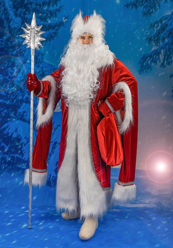 Костюм Деда Мороза Русский красный - это карнавальный костюм для взрослого, выполненный в стилизации боярского наряда. Театральный костюм Деда Мороза предназначен для использования на новогодних утренниках, зимних праздниках, рождественских гуляниях, театральных и сценических постановках. Состав материалов - 100% полиэстер. В комплект входят: головной убор, шуба, рукавицы, мешок. Посох, борода с париком и валенки приобретаются отдельно. Свободная шуба выполнена на размер 50-56 и на рост 170-182 см. и подойдет для актера с любым телосложением. Дополняет образ шапка на подкладке с большим отворотом, отороченная мехом, и широкие рукавицы на подкладке, украшенные сверкающими серебряными снежинками. В комплект костюма также входит вместительный бархатный мешок для подарков. Верхняя часть мешка стягивается шнуром.