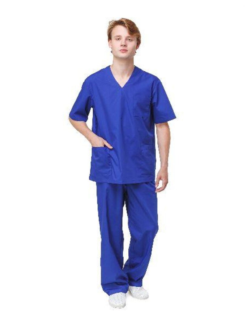 Костюм хирурга универсальный василек имеет блузу прямого покроя с V-образным вырезом горловины, на полочке один верхний и два нижних накладных кармана, рукава короткие, брюки прямого покроя на резинке.