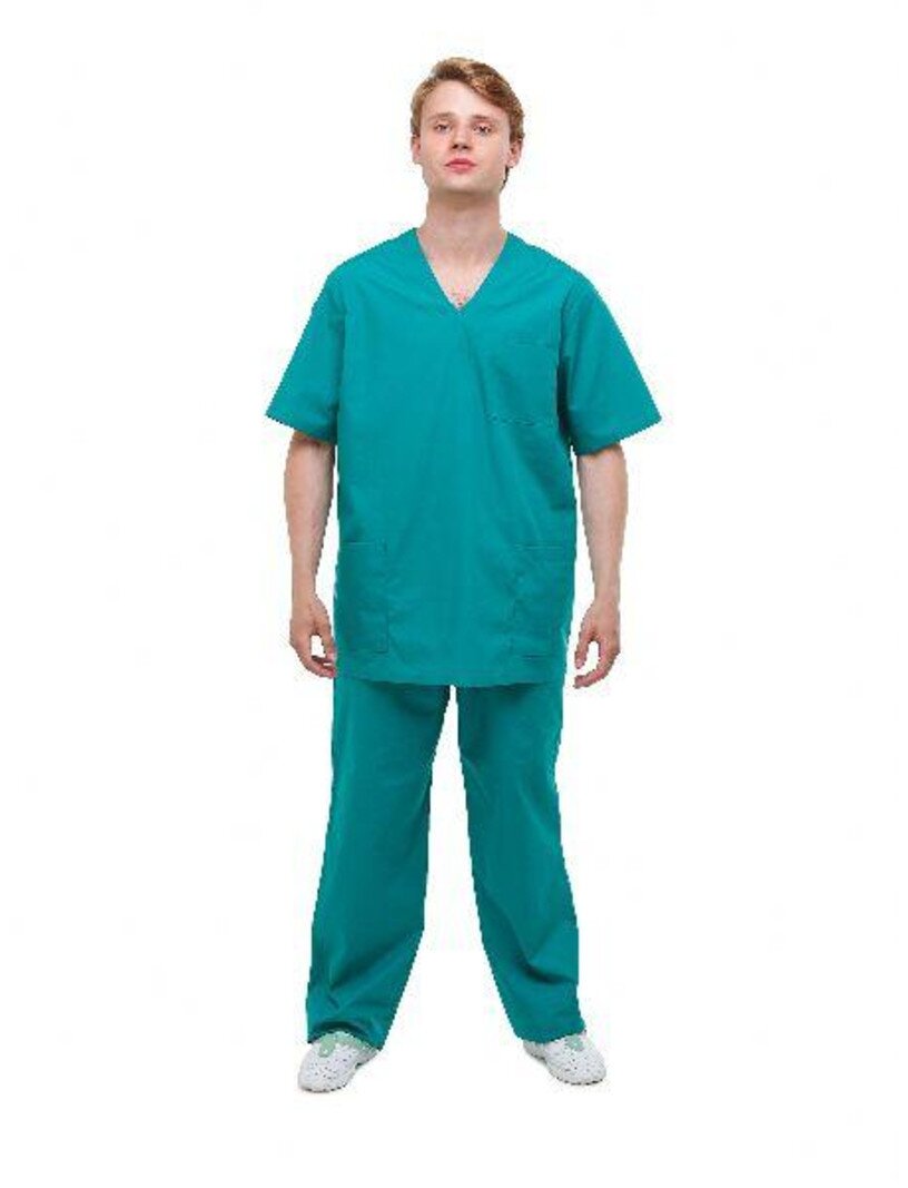 Костюм хирурга универсальный зеленый имеет блузу прямого покроя с V-образным вырезом горловины, на полочке один верхний и два нижних накладных кармана, рукава короткие, брюки прямого покроя на резинке.