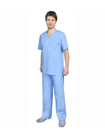Костюм Хирурга универсальный состоит из блузы и брюк.Ткань сорочечная со специальной пропиткой. Блуза:V-образный вырез;карманы – нагрудный слева, боковые накладные;укороченные рукава. Брюки:пояс с эластичной лентой.