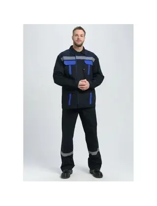Костюм "ИТР"-1 синий рекомендован для работников в строительной сфере, логистике, лёгкой промышленности и других областях;выполнен из смесовой ткани бежевого цвета, со вставками цвета. Ткань состоит из 40% полиэфира и 60% хлопка, плотность 270 г/м²;Куртка прямого силуэта, застёгивается на молнию с ветрозащитной планкой на липучках. Воротник-стойка надёжно защищает шею от ветра. Манжеты на рукавах застёгиваются на пуговицы. Два нагрудных и два боковых кармана застёгиваются на молнию. Для регулировки прилегания по низу куртки предусмотрены паты на кнопках.Брюки прямого покроя, застёгиваются по центру на пуговицу и молнию. На поясе есть шлёвки для ремня и эластичная резинка по бокам. На брюках 6 карманов: 2 боковых и 2 задних, спереди на штанинах 2 дополнительных кармана на молнии.